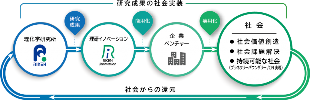 理研の持つ多様で質の高い研究成果を実用化する「パートナー」として、理研と社会の相互成長サイクルを生み出し、社会が循環的に発展することを目指します。